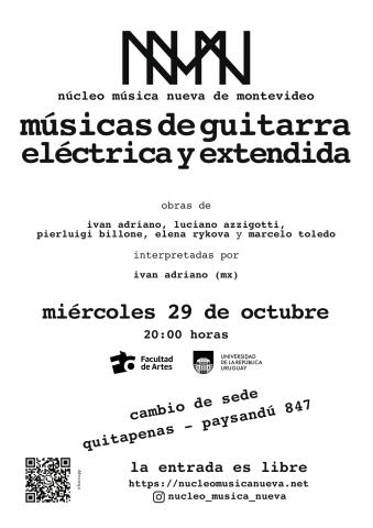 Concierto 790: Músicas de guitarra eléctrica y guitarra extendida Lee más sobre Concierto 790: Músicas de guitarra eléctrica y guitarra extendidaMiércoles 29 de Octubre de 2025 20:00 Quitapenas, Paysandú 847 esq. Andes